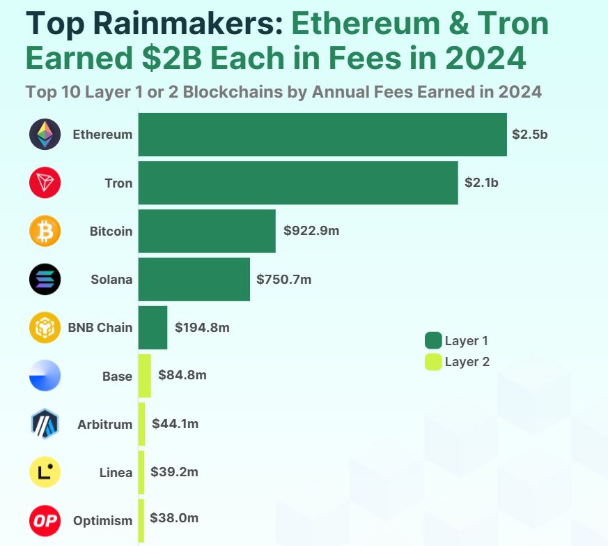 Пять блокчейнов с самым высоким доходом в 2024 году были блокчейнами Layer 1, а лидером стал Ethereum. Источник: CoinGecko.