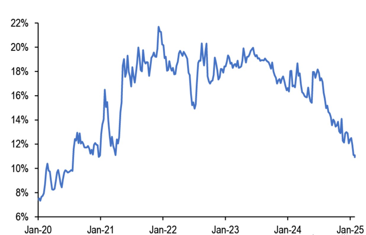 Нечто интересное можно заметить, если взглянуть на капитализацию крипторынка в период после избрания Трампа. Рынок вырос, но Эфир заметно отстаёт по темпам роста от других альткоинов. А его доля в общей капитализации упала до четырёхлетнего минимума.