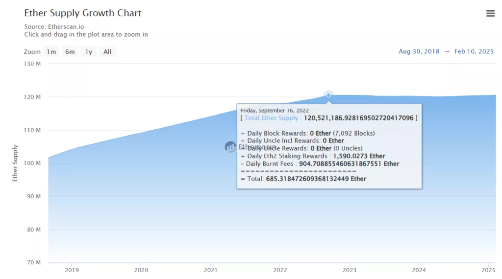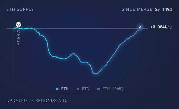 С апреля 2024 года предложение Ethereum демонстрирует стабильный рост, завершив период дефляции, начавшийся после активации The Merge. На фоне пониженной ончейн-активности объем предложения эфира уже превысил показатели сентября 2022 года.
