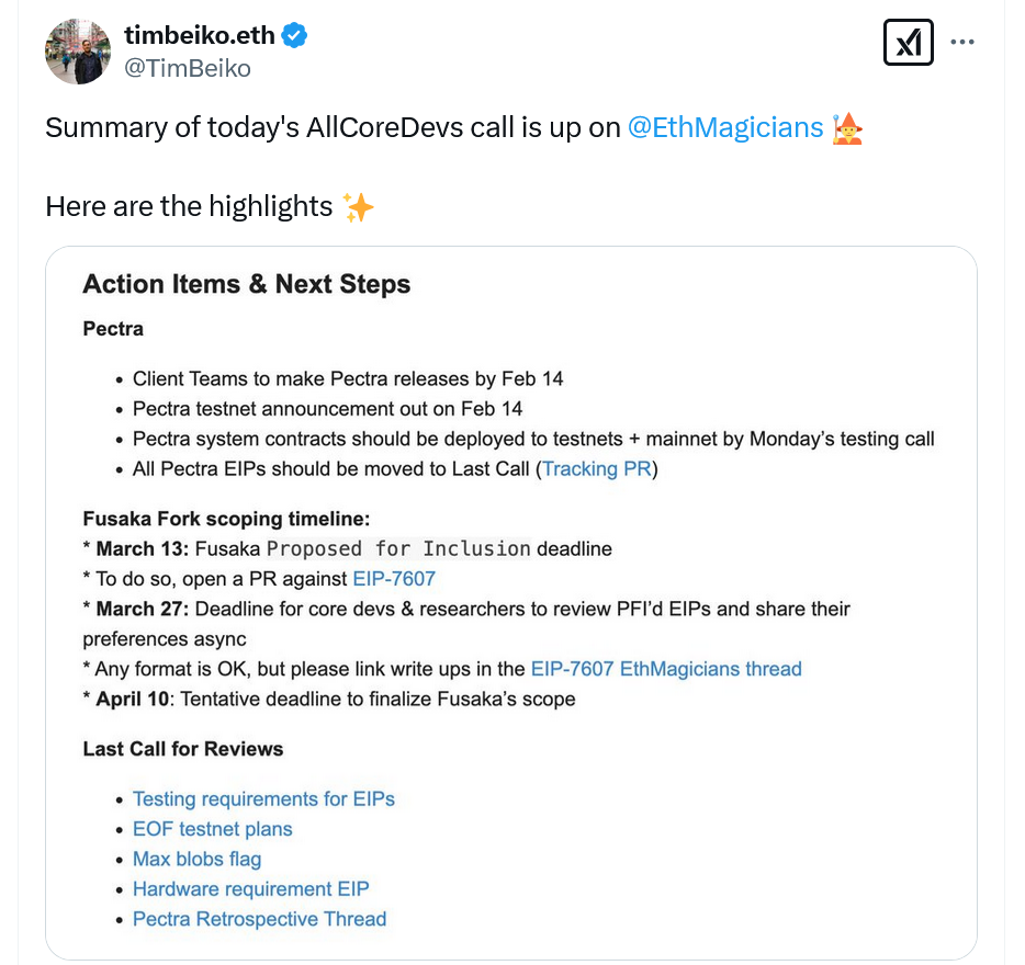 «Довольно сильный консенсус из поста Pectra Retrospective о том, что люди хотят более быстрых темпов форков», — сказал Никсо Рокиш, член команды поддержки протокола EF, в посте X от 13 февраля