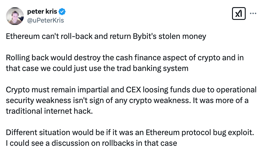«Я полностью поддерживаю откат блочкчейна Ethereum (снова), чтобы украденные ETH были возвращены Bybit, а также чтобы помешать правительству Северной Кореи использовать эти средства для финансирования своей программы по созданию ядерного оружия».