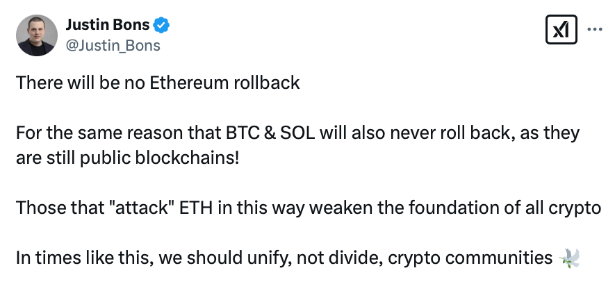Некоторые из самых выдающихся деятелей отрасли были среди тех, кто выступал за откат Ethereum. Генеральный директор Jan3 Сэмсон Моу сказал в сообщении X от 22 февраля: