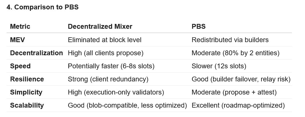 «Эта система преодолевает это: создание блоков распространяется на тысячи клиентов по всему миру, полностью демократизируя процесс. Ни одна отдельная сущность не доминирует — в отличие от пула создателей PBS или централизованного микшера — и BFT смягчает дисперсию пула памяти, обеспечивая надежность».
