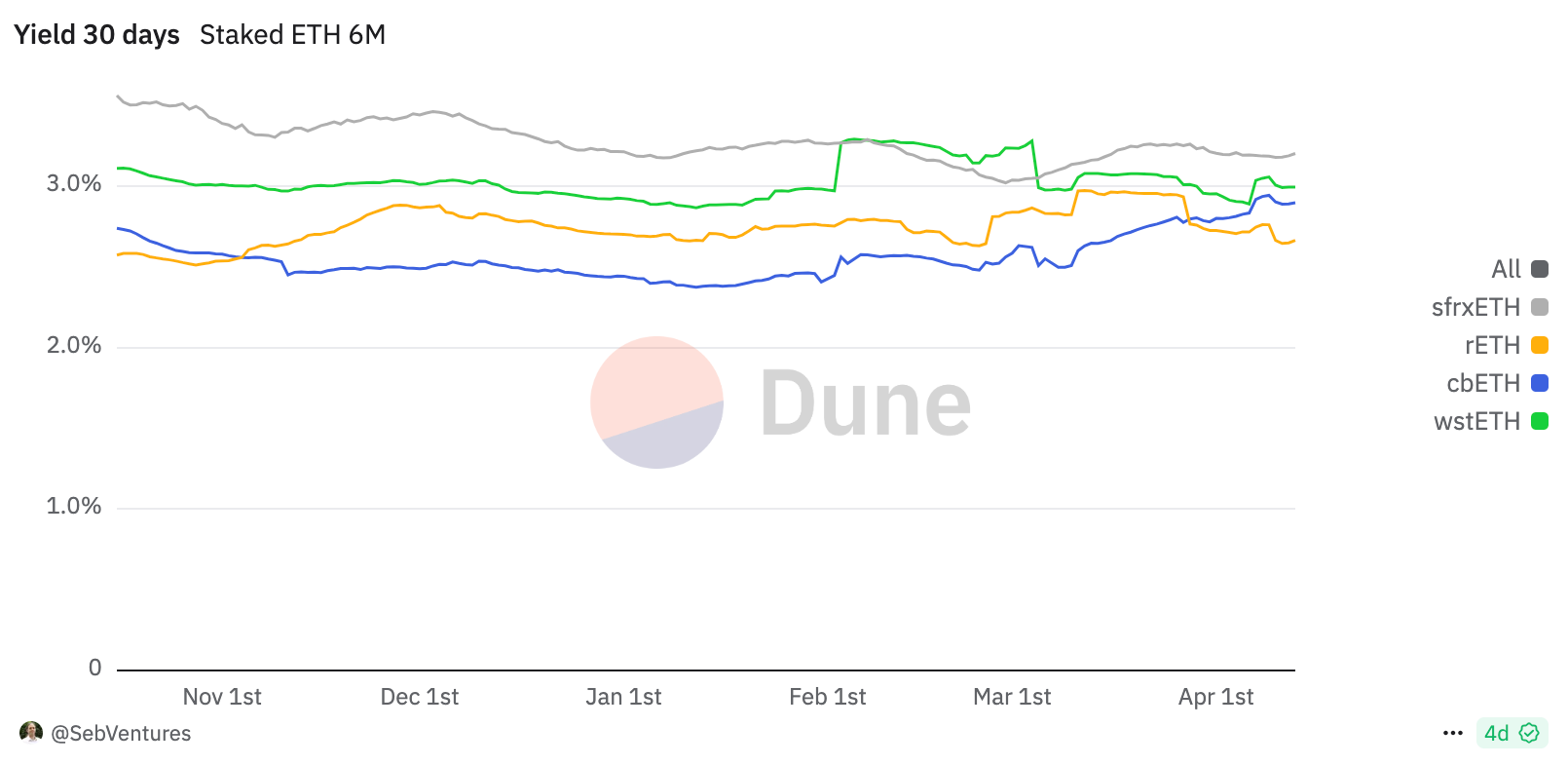 30-дневная доходность стекинга ETH по состоянию на 13 апреля. Источник: Dune Analytics.