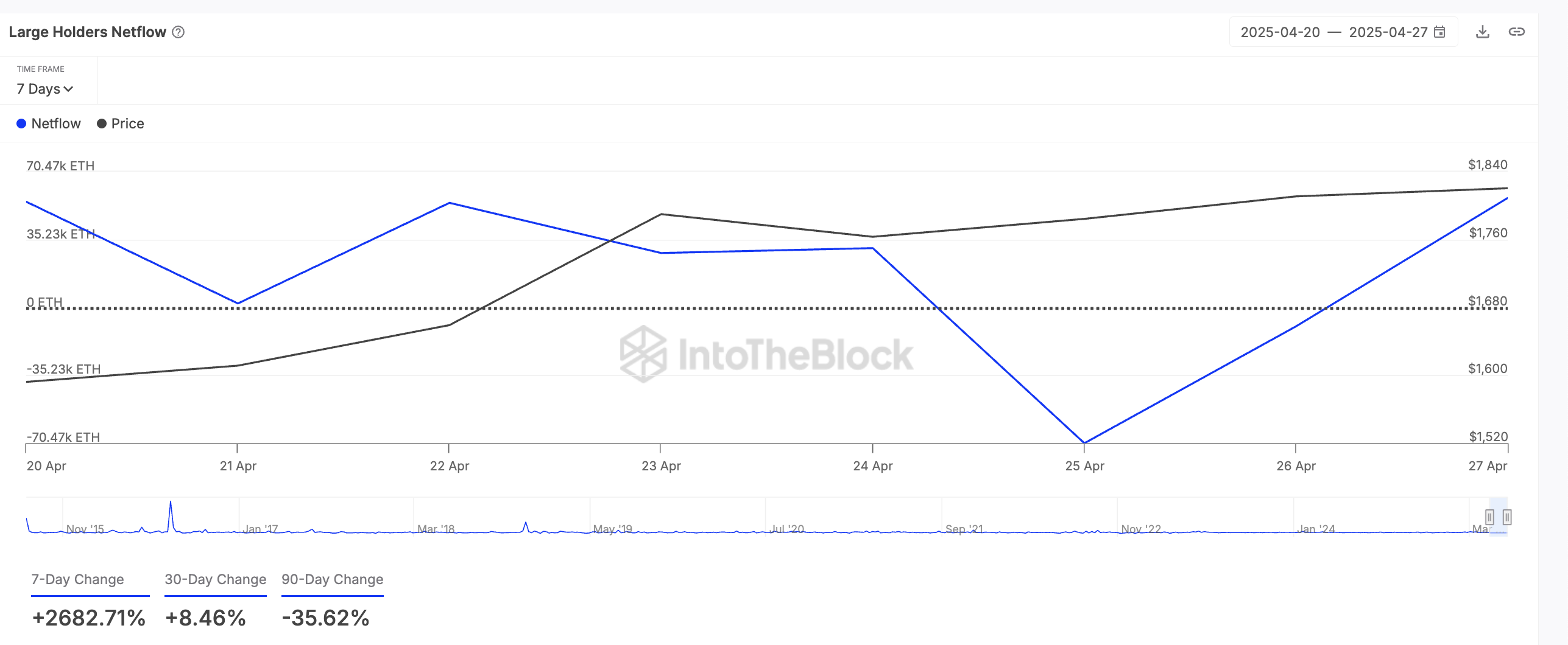 Согласно ончейн-данным, ведущий альткоин за последнюю неделю зафиксировал значительный скачок в чистом притоке от крупных держателей. Показатель вырос на 2 682% за последние семь дней.