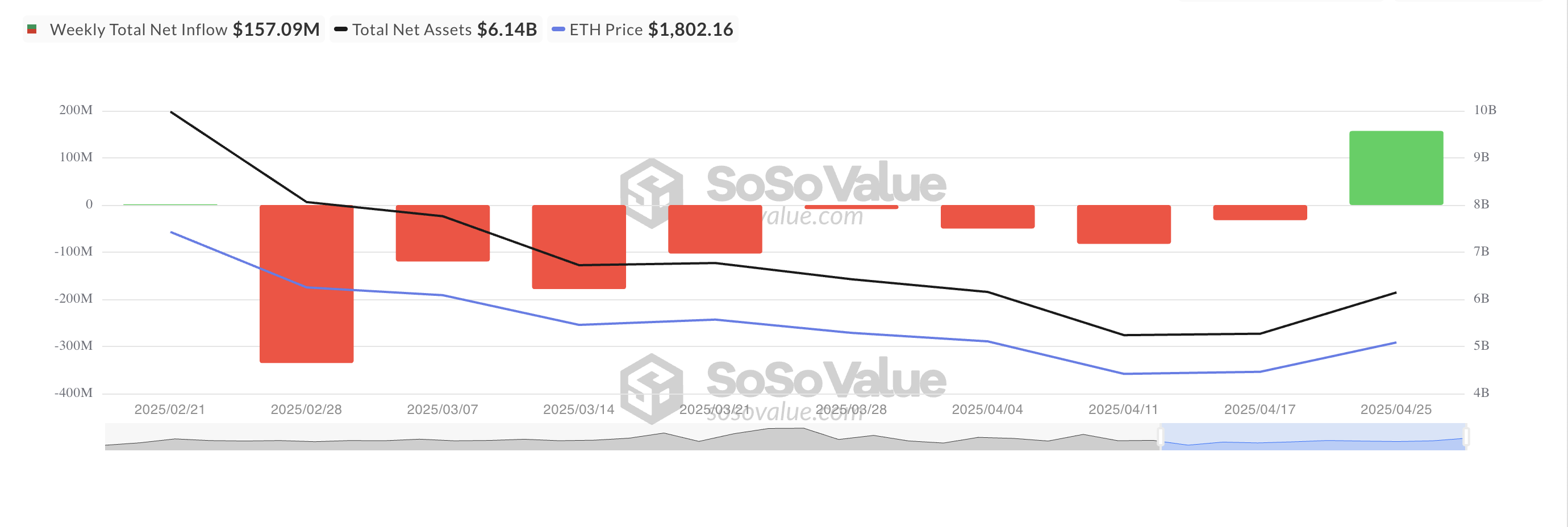 ETF на базе ETH зафиксировали первый недельный приток за последние восемь недель. По данным SosoValue, с 21 по 25 апреля чистый приток в эти ETF составил $157,09 млн, что прервало восьминедельную полосу оттоков, превышающих $700 млн.