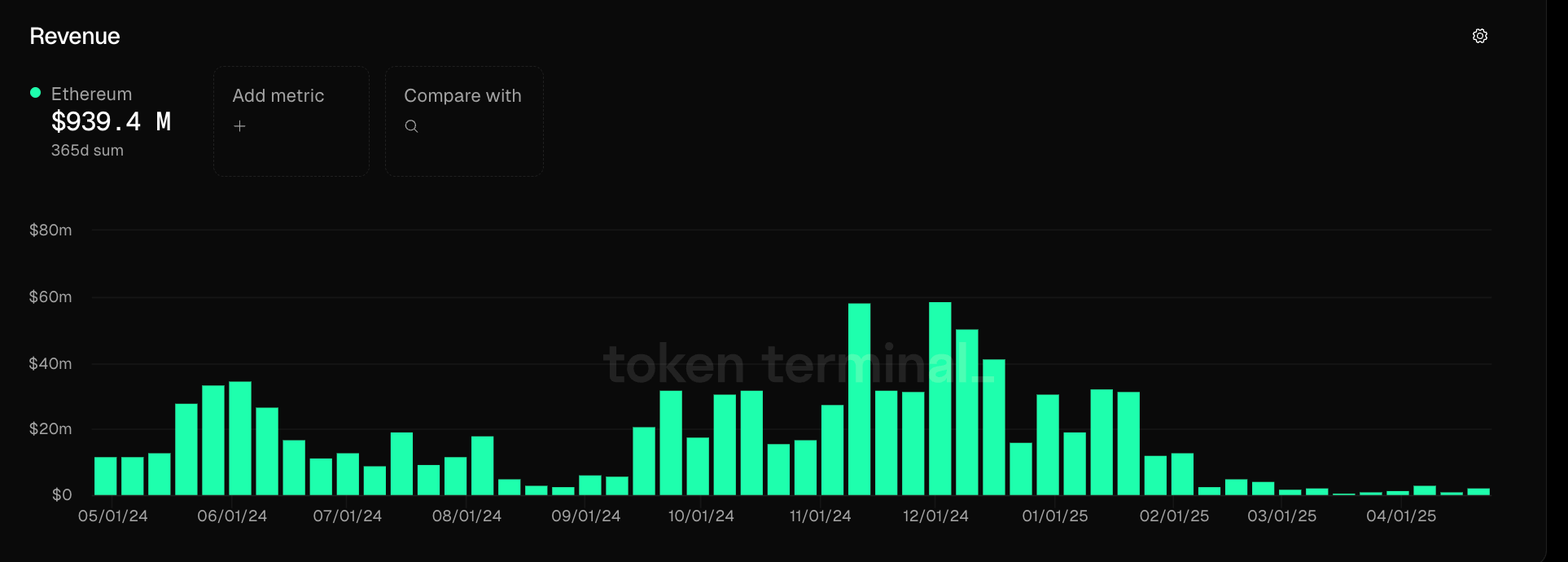 Контекст также важен. В марте 2024 года прошёл апдейт Dencun, из-за которого резко упали комиссии на L2. Уже к сентябрю доходность основного слоя Ethereum просела на 99%. По данным за апрель 2025 года, средняя стоимость транзакции на базовом слое опустилась до $0.16 — самый низкий показатель за последние пять лет.