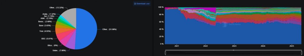 Однако, как показывают данные, доминирование Ethereum резко ослабло с 2021 года, когда данный L1 контролировал до 96% совокупного TVL.