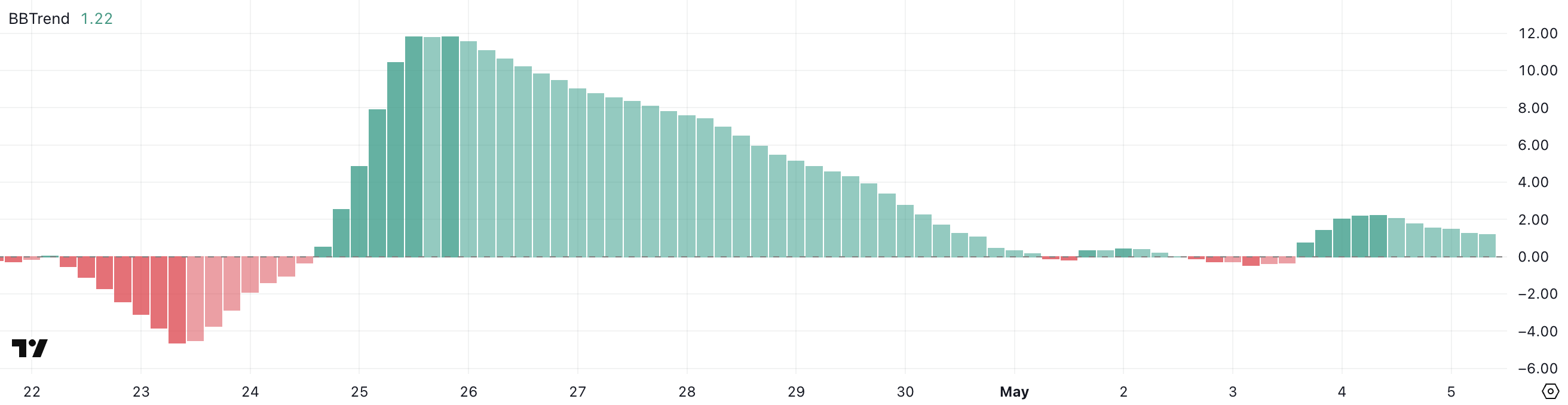 Индикатор BBTrend для Ethereum на момент написания держится на уровне 1,22, что указывает на слабый бычий тренд. При этом вчера BBTrend достиг 2,23, демонстрируя более сильный импульс. Если значения индикатора снова начнут увеличиваться, это станет сигналом об укреплении восходящего тренда; при этом снижение значений укажет на угасание бычьего импульса.