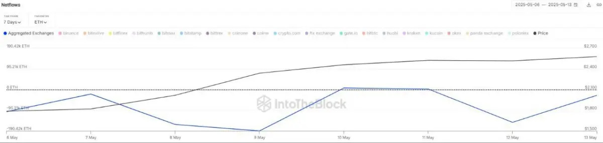 Данные Sentora показывают, что тенденция отрицательного чистого потока продолжается с конца апреля и усилилась в мае. С 24 апреля по 1 мая биржи ежедневно фиксировали чистый отток ETH, а наиболее заметный объём вывода пришёлся на 26 апреля. Это может говорить о растущем дефиците предложения.