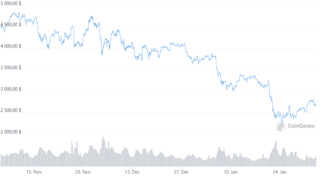 Мы уточнили свежие данные: даже сейчас с учётом провалившегося рынка за последний год курс Эфириума вырос на 74.84 процента. В то же время соответствующий показатель Биткоина составляет 3.96 процента.