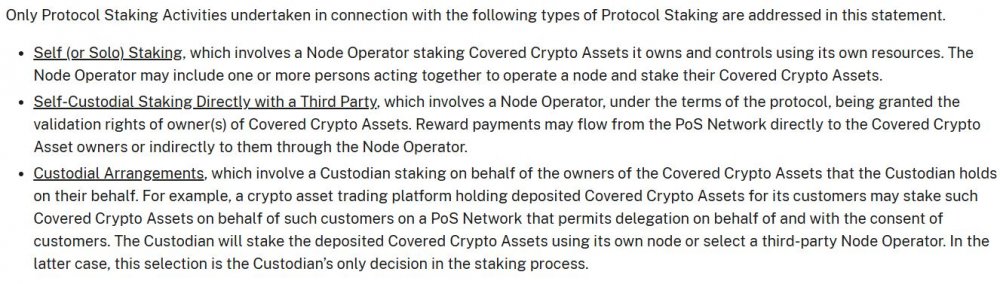 «Деятельность по стекингу таких протоколов, как PoS, не требует регистрации транзакций в соответствии с Законом о ценных бумагах», — говорилось в заявлении Отдела корпоративных финансов SEC от 29 мая.