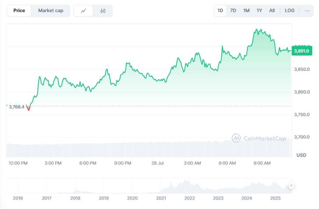 На момент написания Ethereum торгуется на отметке 3891,07 доллара США, за последние 24 часа его курс вырос на 3,23%.