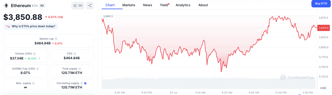 На момент написания статьи курс Ethereum составлял $3850,88, снизившись на 0,47% за последние 24 часа. В течение сессии цена колебалась в диапазоне от $3750 до $3880, при этом волатильность возросла в конце торгов в США.