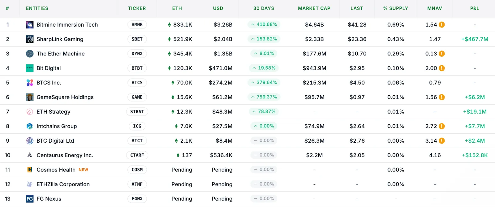 По состоянию на 8 августа под управлением публичных компаний находятся 3 млн ETH на сумму $11,9 млрд. Лидер — BitMine Immersion Technologies, удерживающая 833 100 ETH стоимостью $3,2 млрд.