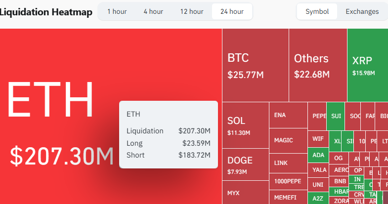 Этот внезапный, резкий рост спровоцировал масштабное сокращение коротких позиций, уничтожив трейдеров, настроенных «медвежьей» тенденцией. За последние 24 часа было ликвидировано более 205 миллионов долларов по кредитным позициям ETH, причём целых 183 миллиона долларов из них принадлежали игрокам, игравшим на понижение цены. Это явный признак того, что рынок был совершенно застигнут врасплох.