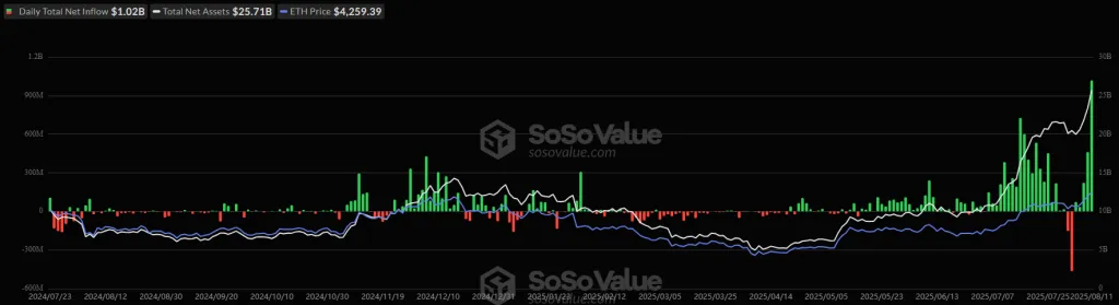 За последнюю торговую сессию приток капитала в спотовые биржевые фонды на базе эфира достиг рекордных $1,02 млрд.