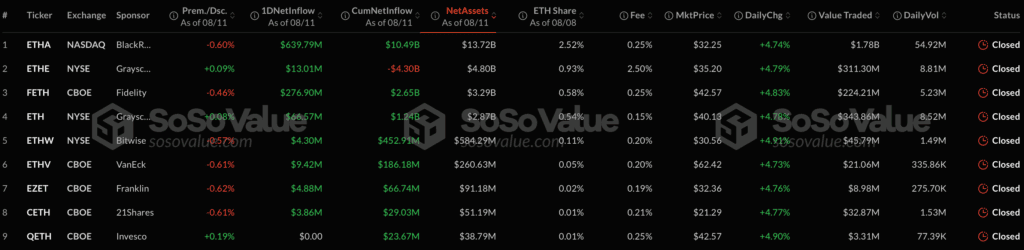 - ETHA от BlackRock — $639,79 млн;