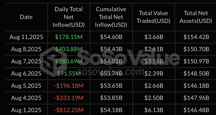 В секторе спотовых биткоин-ETF наблюдалось поступление инвестиций в размере $178,15 млн. Положительная динамика продолжается уже четвертый торговый день подряд.