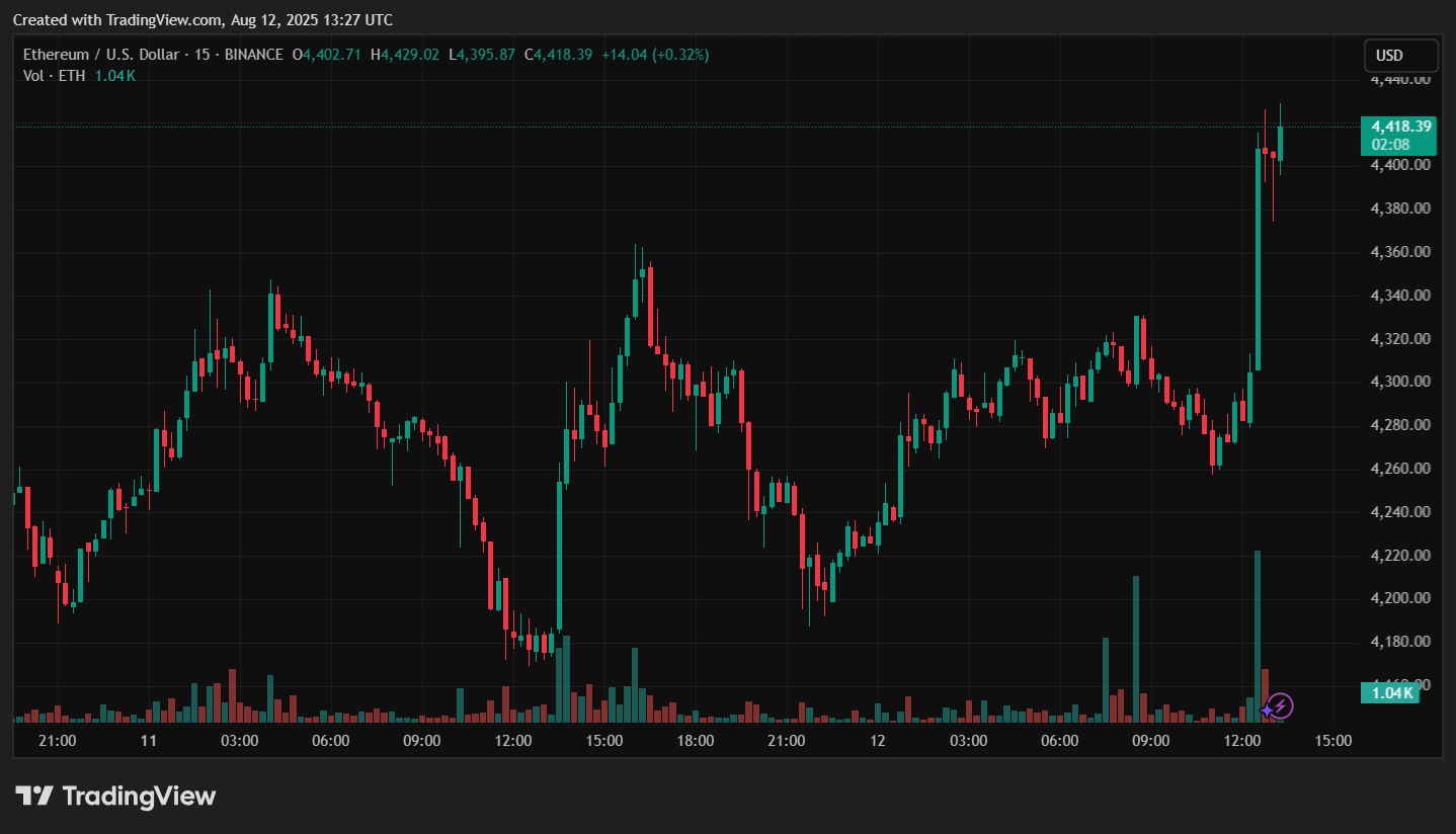Цена Ethereum за последние сутки увеличилась на 5,4%, актив торгуется на уровне $4416.