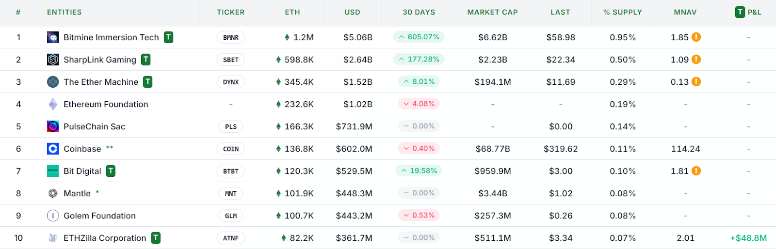 BitMine лидирует среди корпоративных держателей Ethereum. За ней следуют SharpLink с 598 800 ETH ($2,6 млрд) и The Ether Machine с 345 400 ETH ($1,5 млрд).