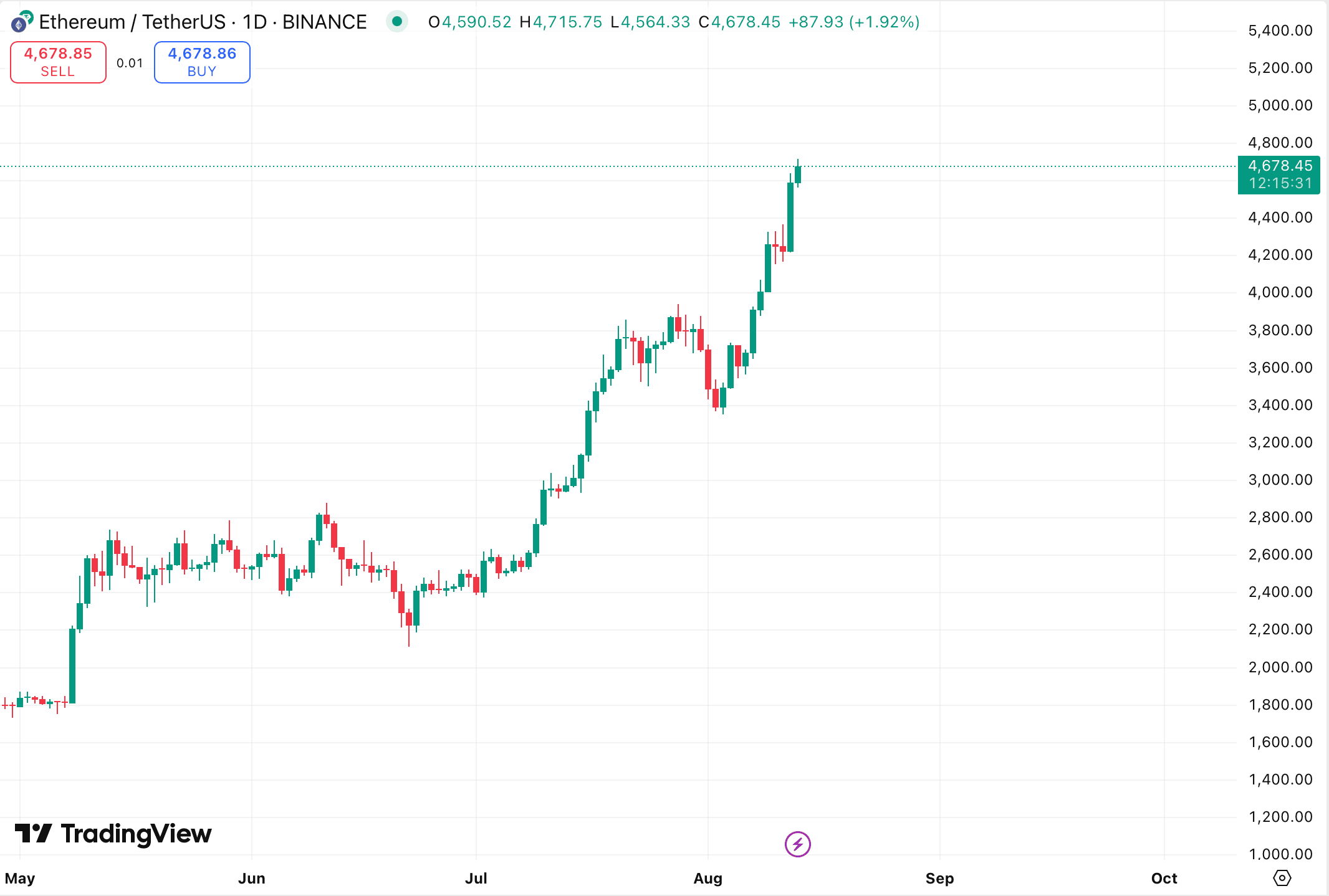 Вторая по капитализации криптовалюта находится на уровне $4678,45, согласно TradingView на момент подготовки материала.