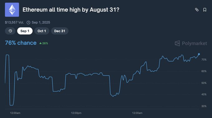 - Игроки Polymarket оценивают вероятность того, что Ethereum достигнет новых максимумов до 31 августа, в 76%.