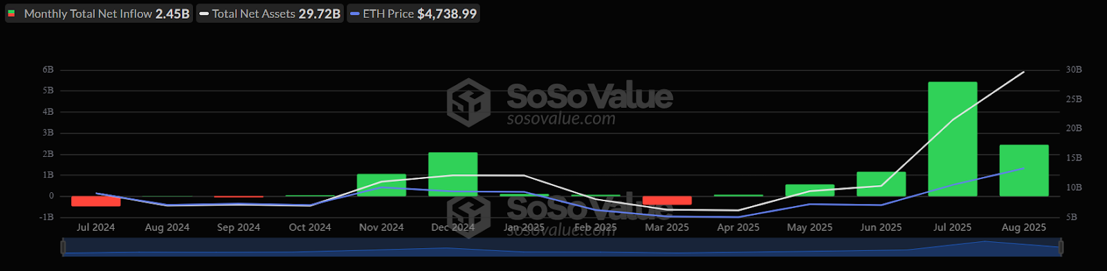 Текущая неделя также отметилась рекордным притоком — инвесторы вложили $2,27 млрд в девять спотовых Ethereum-ETF.