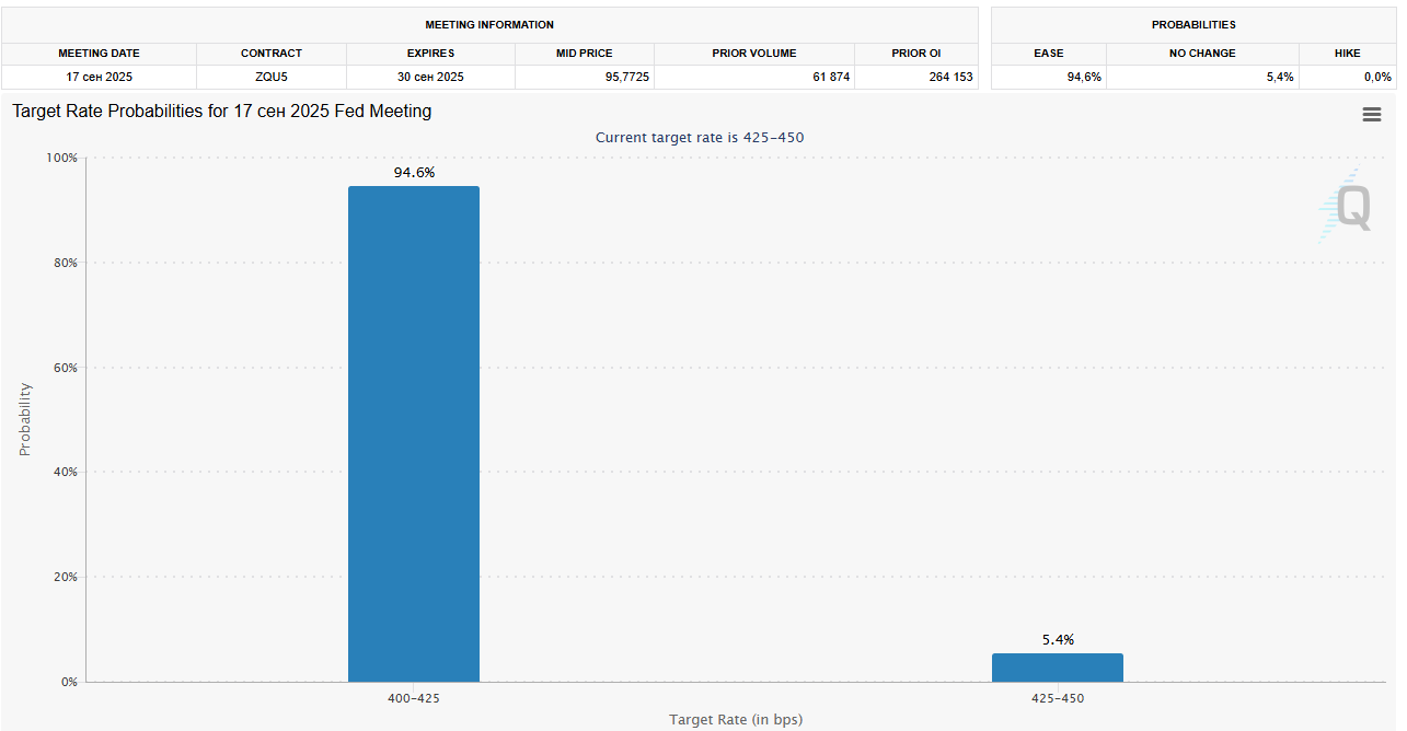 Участники рынка оценивают вероятность снижения ставки в сентябре в 94,6%.