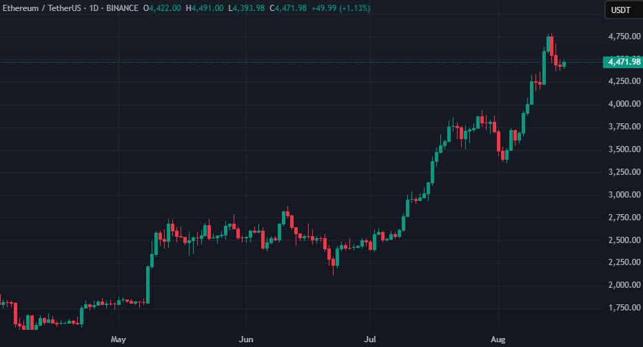 На момент написания Ethereum торгуется вблизи отметки в $4500: