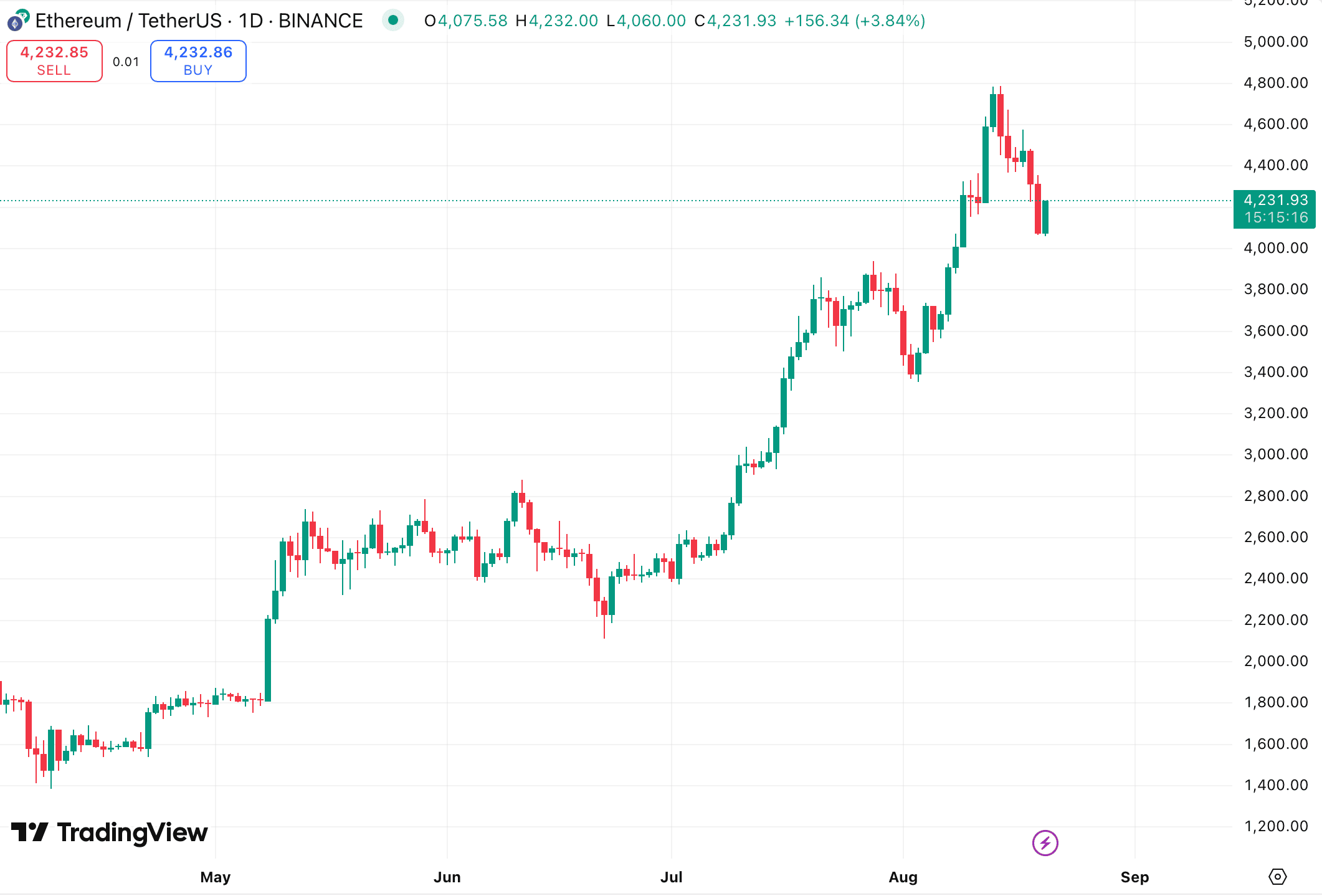 Вторая по капитализации криптовалюта торгуется по цене $4232, согласно TradingView на момент подготовки материала.