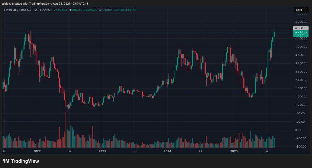 Ethereum достиг нового исторического максимума в $4 887, обновив предыдущий рекорд ноября 2021 года. 22 августа цена второй по капитализации криптовалюты взлетела на 15%, когда председатель Федеральной резервной системы Джером Пауэлл (Jerome Powell) подтвердил сентябрьское снижение процентных ставок.