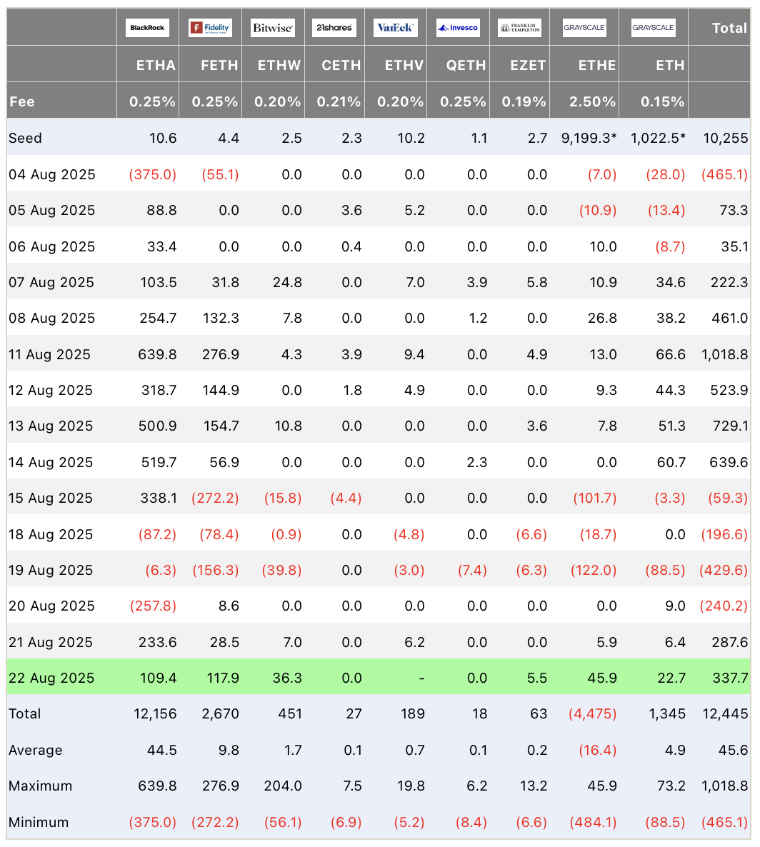 Возобновившийся приток инвестиций в американские Ethereum-ETF придают дополнительный импульс росту. После четырех дней оттока капитала 21 августа фонды привлекли $287,6 млн. Общий объем активов под управлением Ethereum-ETF уже превысил $12,12 млрд.