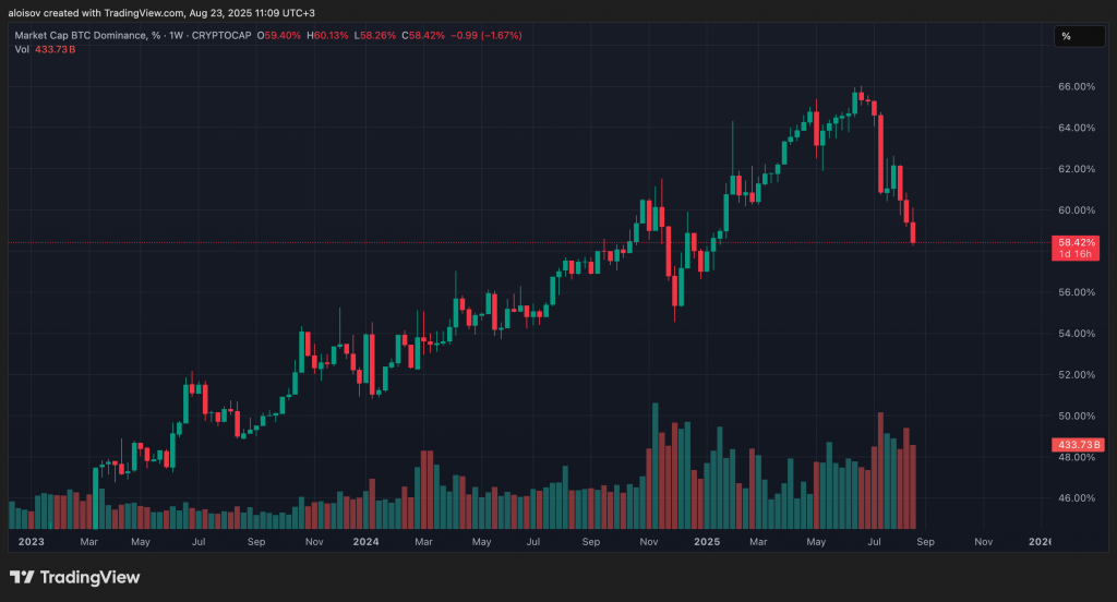 Рост ETH совпал с заметным снижением доминирования биткоина. Доля первой криптовалюты в общей капитализации рынка упала ниже 60% впервые за четыре месяца. На пике года BTC контролировал 66% рынка.