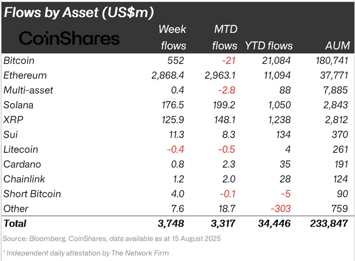 Приток капитала в инвестиционные продукты также отражают растущий оптимизм вокруг ETH. На неделе, завершившейся 15 августа, Ethereum-продукты привлекли $2,86 млрд против $552 млн у биткоина, сообщает CoinShares.