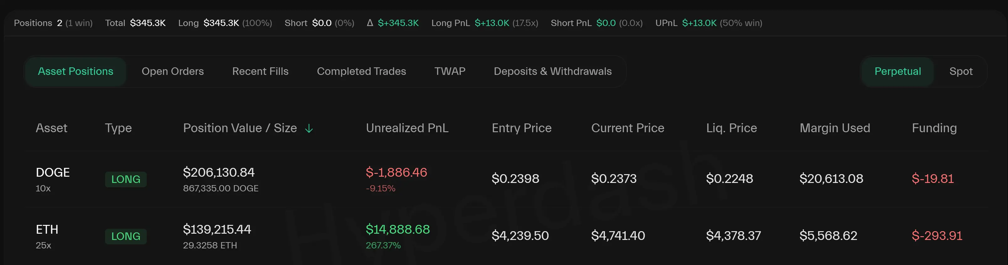 Уинн также удерживает длинную позицию по Dogecoin (DOGE) с плечом 10x объемом 867 335 DOGE на сумму $206 130. Сделка была открыта по средней цене $0,2398, но в настоящее время показывает нереализованный убыток $1886 при текущей цене DOGE около $0,237.