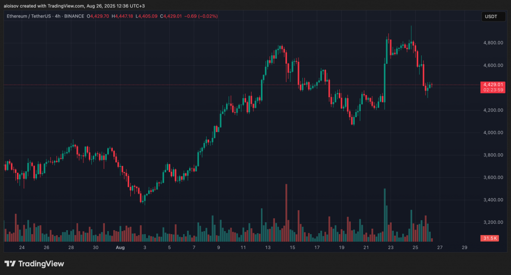 Тем временем BitMine Immersion Technologies продолжила агрессивное накопление Ethereum, покупая на падении 26 августа 4 871 ETH стоимостью $21,3 миллиона, согласно Arkham Intelligence. Это довело общие активы компании до 1,72 миллиона ETH стоимостью около $7,5 миллиарда по текущим рыночным ценам.