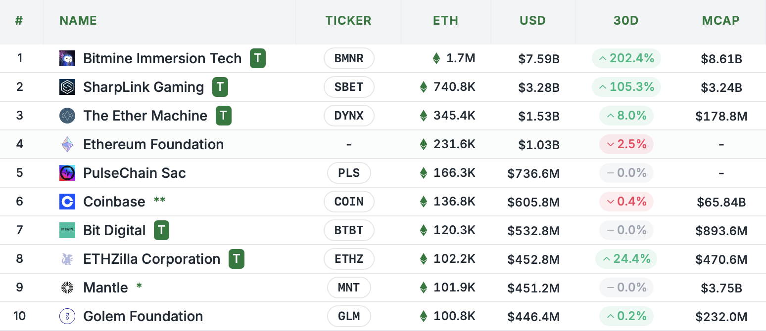 BitMine является явным лидером рынка среди компаний с Ethereum-резервами с 40% долей от 4,3 миллиона ETH, которые держат корпоративные структуры, согласно Strategy Eth Reserve.