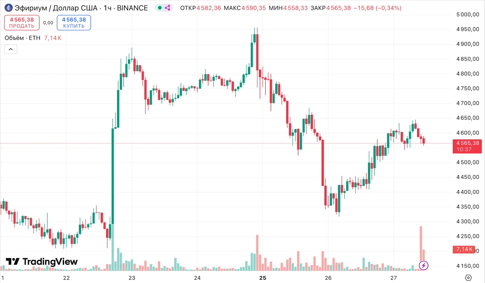 За последние сутки Ethereum подорожал на 3,3%, а за неделю — на 7,9%. На момент написания актив торгуется по $4565.