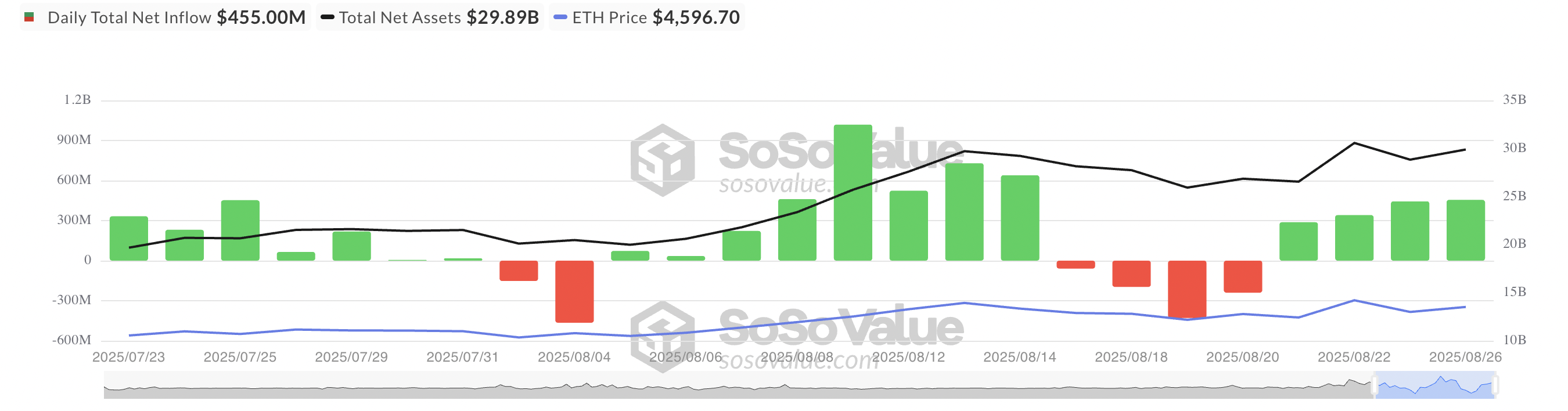По данным SosoValue, ETF на основе ETH привлекли более $1,8 млрд с 21 августа. Это превышает аналогичный показатель $388 млн для BTC и отражает резкий сдвиг в институциональном интересе. Потоки капитала все больше склоняются в пользу ETH по сравнению с BTC.