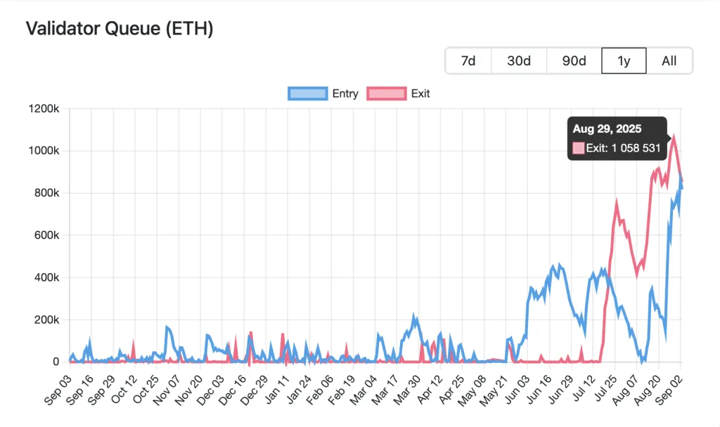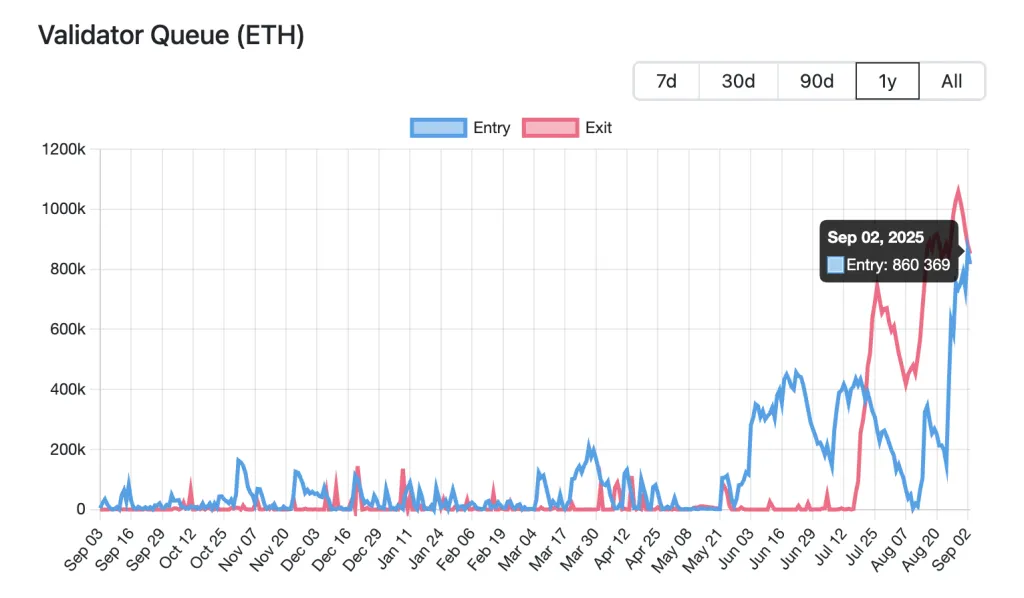 Очередь на выход из стейкинга снизилась на 20% после достижения 29 августа рекордной отметки в 1 млн ETH — до 851 931 ETH.
