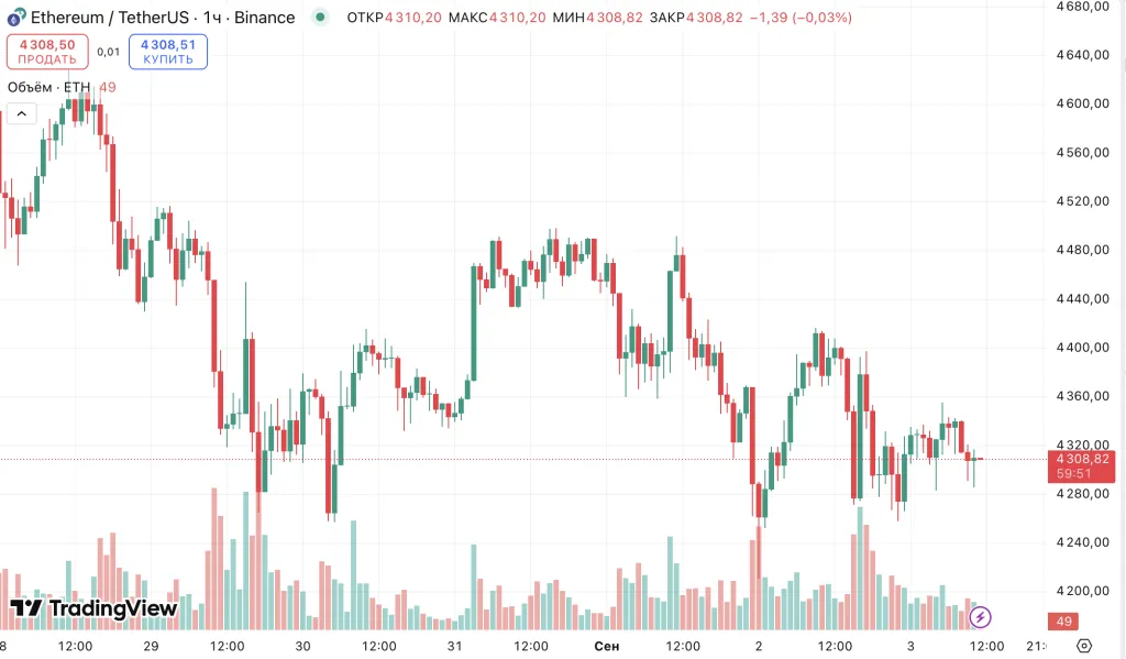 За последние сутки цена Ethereum опустилась на 2,1%. На момент написания актив торгуется по $4298.