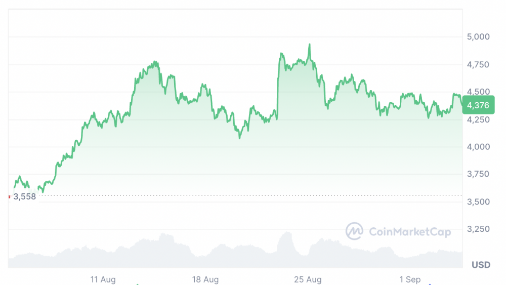 По данным CoinMarketCap, цена ETH составляет $4376, что на 197,30% выше годового минимума в $1472, зафиксированного 9 апреля.