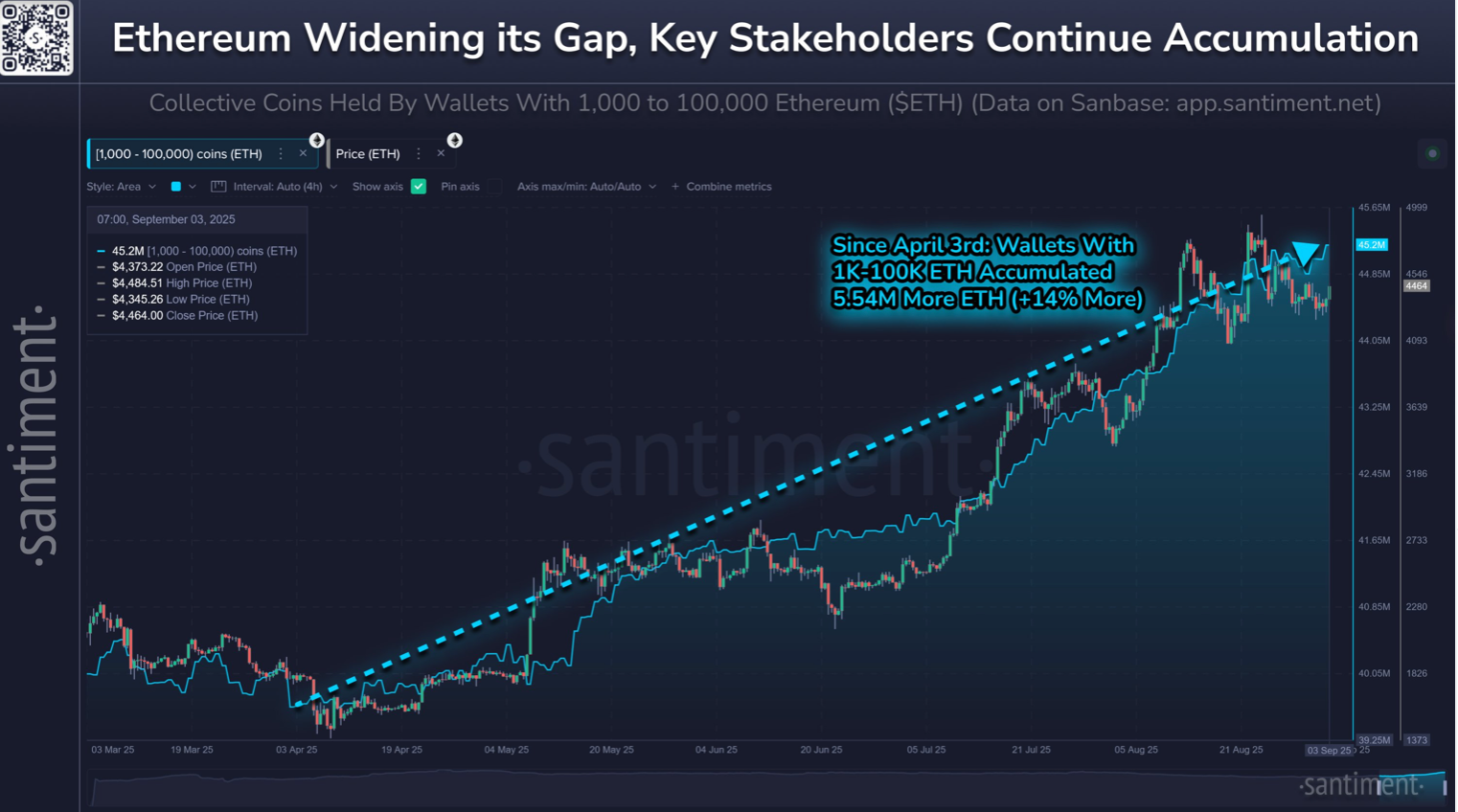 «Ровно за 5 месяцев они добавили на 14,0% больше монет», — сообщил Santiment в сообщении на X в среду, имея в виду держателей-китов с 1 000–100 000 ETH на сумму от 4,41 до 440,81 млн долларов США.