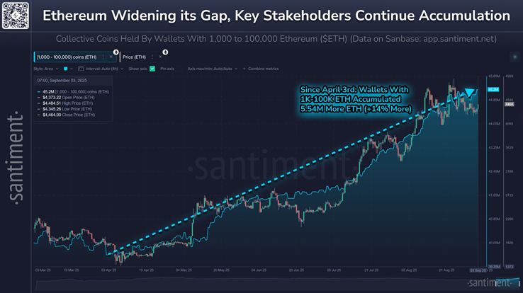 Согласно предоставленной платформой информацией, с апреля крупные владельцы эфира увеличили свои запасы на 14%, приобретя в общей сложности 5,54 млн ETH. Сейчас они владеют 42,5 млн ETH на $186,4 млрд — около 35% от общего предложения второй по капитализации криптовалюты на рынке.