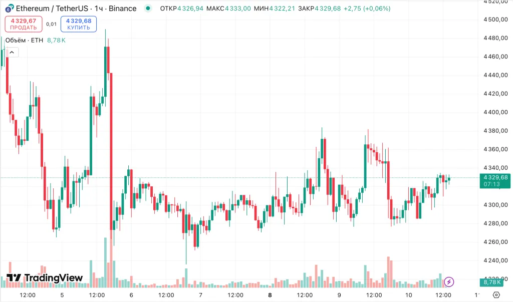 На момент написания Ethereum торгуется около $4300. За последние сутки цена монеты снизилась на 0,6%.