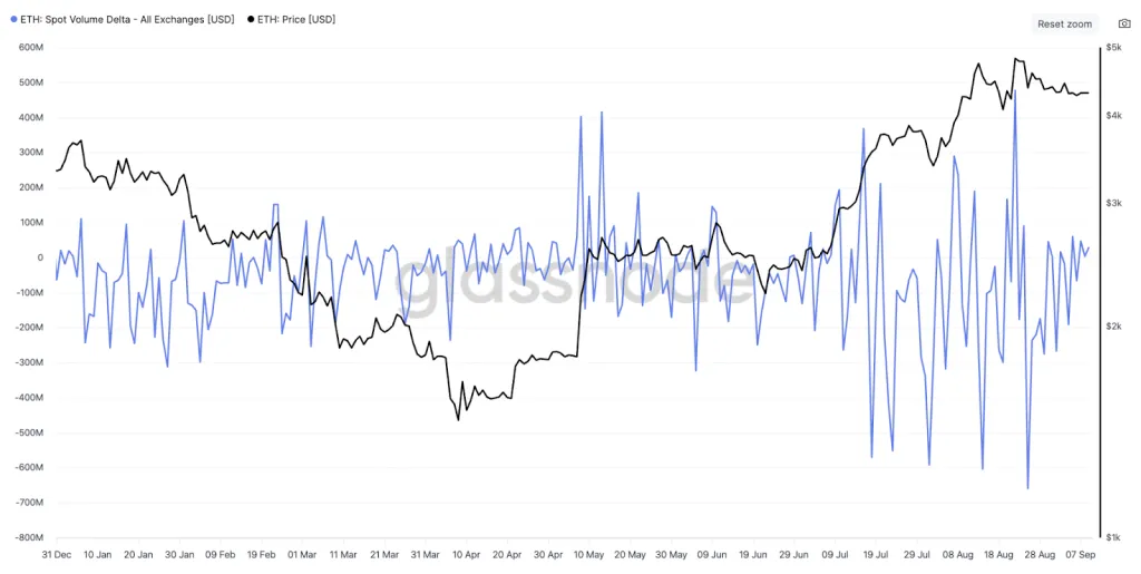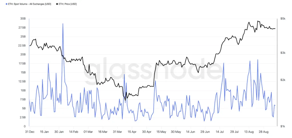 В последние две недели Ethereum торгуется в диапазоне $4200-4500 на фоне снижения спроса со стороны розничных и институциональных инвесторов. По сравнению с концом августа объем торгов криптовалютой упал на 85% — с $18,5 млрд на 22 августа до $2,6 млрд на 8 сентября, согласно Glassnode.