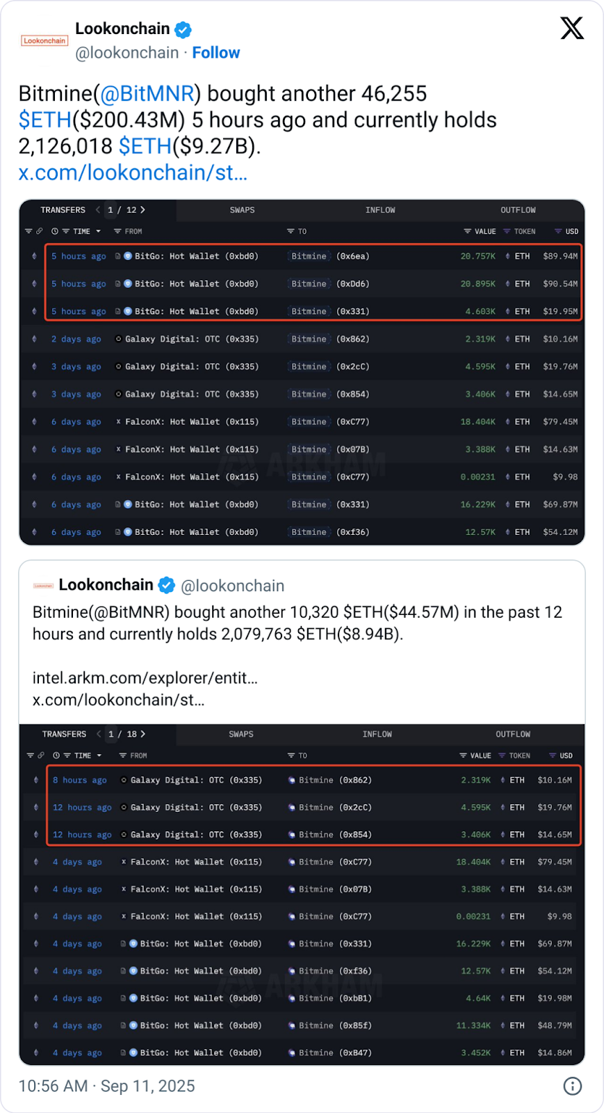 Компания BitMine Immersion Technologies, специализирующаяся на казначейских активах Ethereum, совершила вторую крупную покупку на этой неделе, приобретя ETH на $200 млн. Эта сделка увеличила общий объем резервов компании до более чем $9,2 млрд.