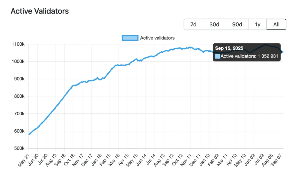 Переход на PoS также повысил децентрализацию, снизив барьеры входа для участников сети. На момент написания в Ethereum активно более 1 млн валидаторов.