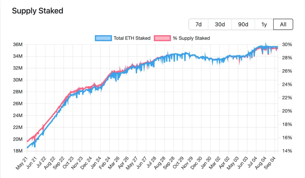 Объем заблокированных монет в сети второй по капитализации криптовалюты превышает 3,6 млн ETH на сумму $162,4 млрд — почти 30% от общего предложения Ethereum.